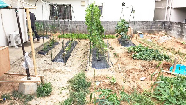 庭に畑があり、野菜や果物を育てています。二階建てで、大きなホームです。