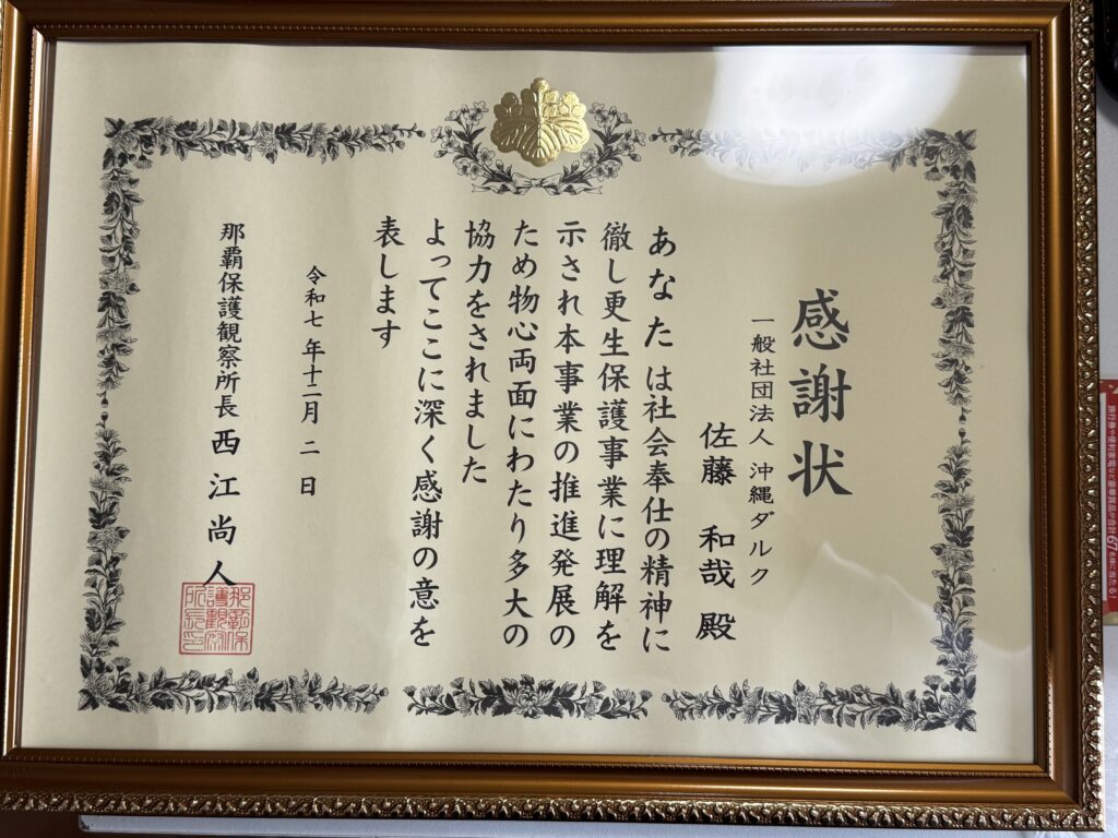 先日の秋季善行表彰に続き、令和7年度沖縄県更生保護大会において表彰を賜りましたので、ご報告申し上げます。